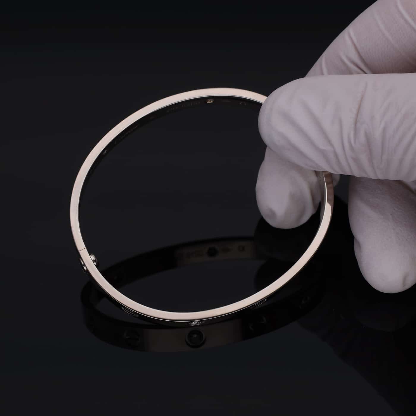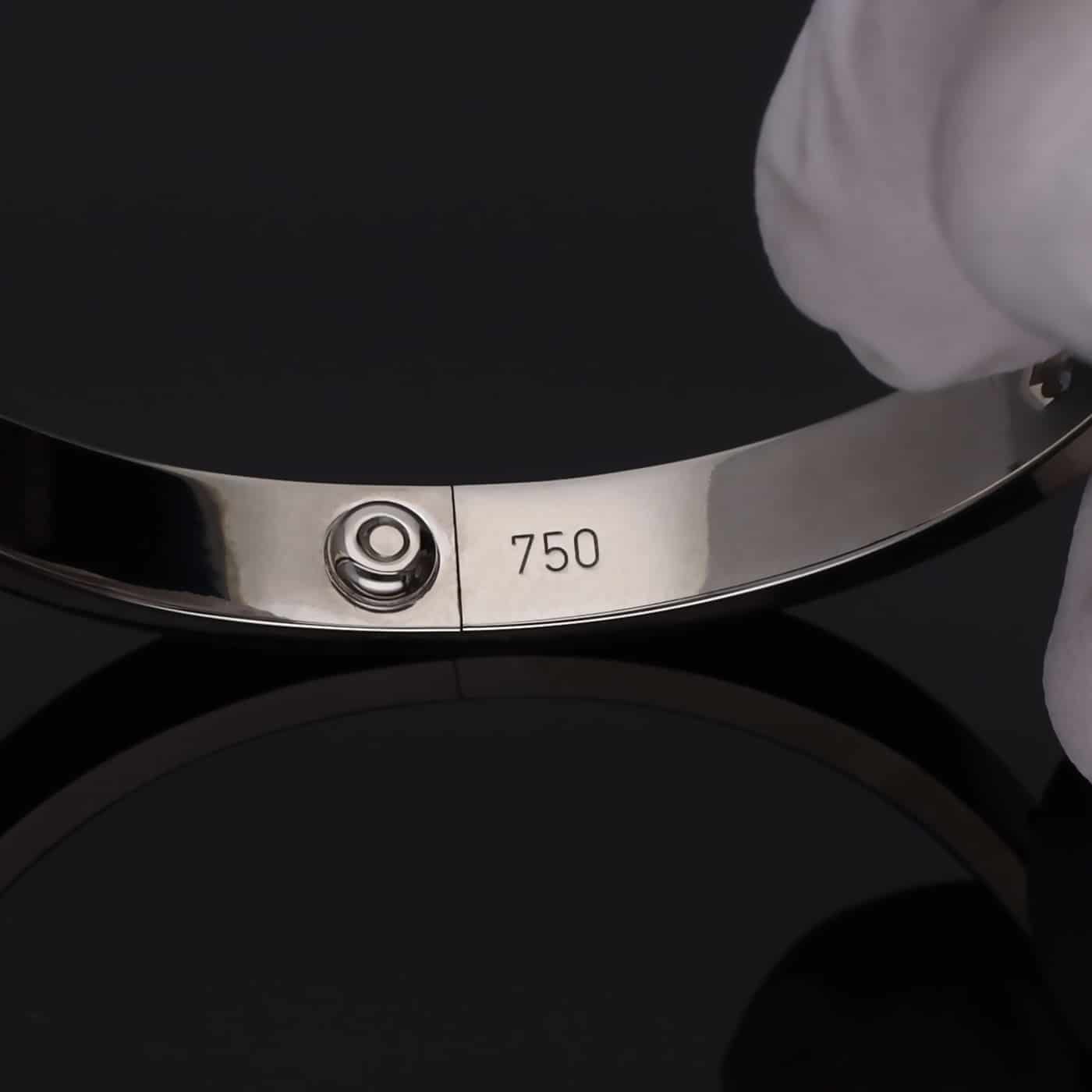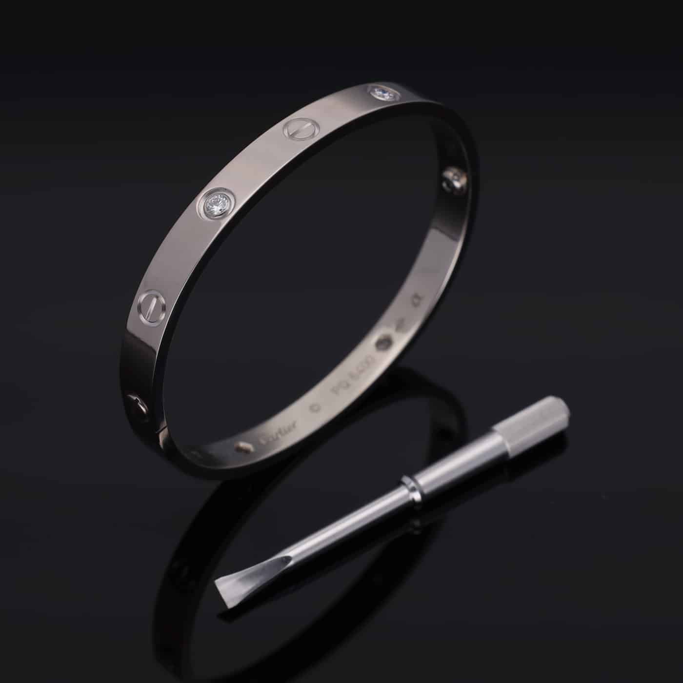Der ikonische Cartier Love Armreif in edlem 750er Weißgold verkörpert zeitlose Eleganz und tiefe Verbundenheit. Das klassische Design wird durch vier funkelnde Diamanten (gesamt ca. 0,42 ct) veredelt, die dem Schmuckstück eine dezente, luxuriöse Ausstrahlung verleihen. In Größe 17 und mit dem typischen Schraubverschluss ist der Armreif ein Symbol ewiger Liebe – puristisch, stilvoll und unverkennbar Cartier.