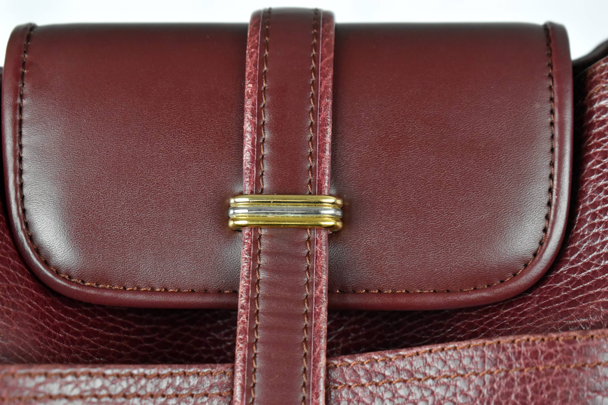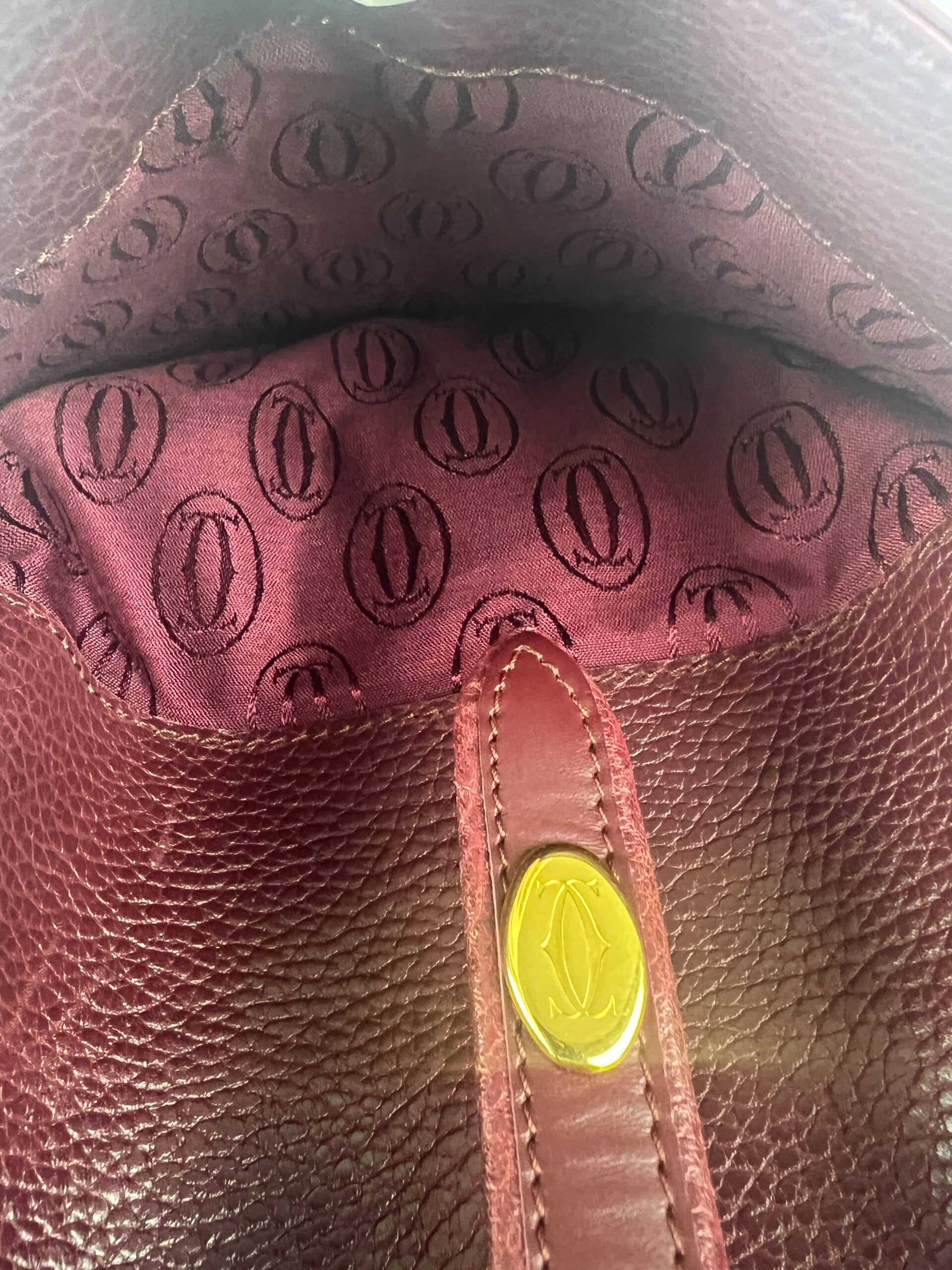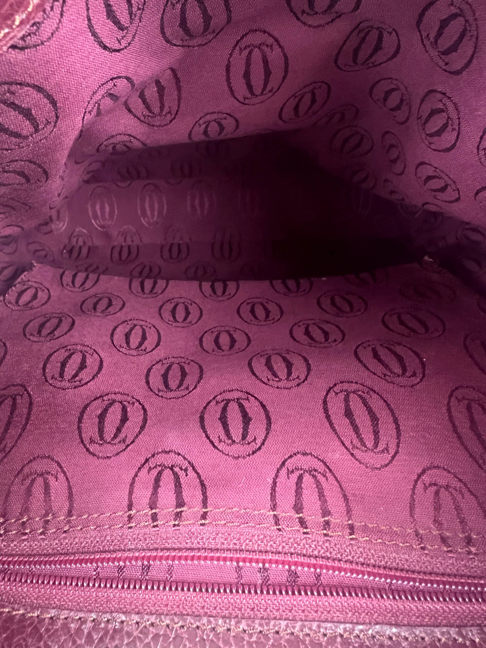Elegante Cartier Must Line Schultertasche in edlem Bordeaux. Die Tasche überzeugt durch ihr zeitloses Design und die hochwertige Verarbeitung, für die Cartier bekannt ist. Sie befindet sich in gutem Zustand und weist keine nennenswerten Beschädigungen auf. Ein stilvolles Accessoire für Alltag und besondere Anlässe.