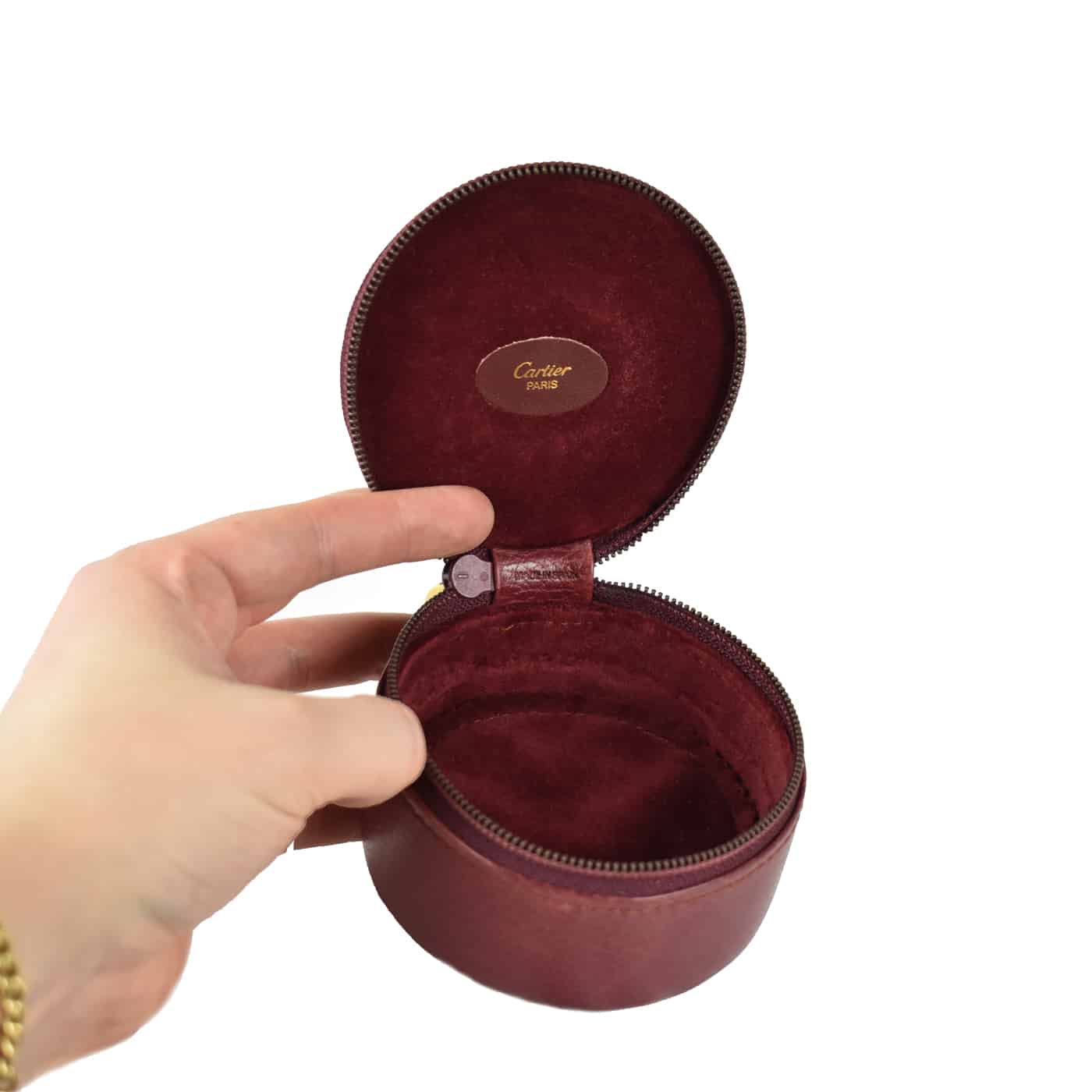 Diese Cartier Schmuck Mini Tasche in Bordeaux ist eine sehr selten erhältliche Vintage-Aufbewahrungsbox für hochwertigen Schmuck. Sie eignet sich ideal für Reisen und ist ebenso perfekt für die stilvolle Aufbewahrung zu Hause. Mit ihrem eleganten Design ist sie ein exklusives Accessoire für Liebhaber klassischer Cartier-Ästhetik.