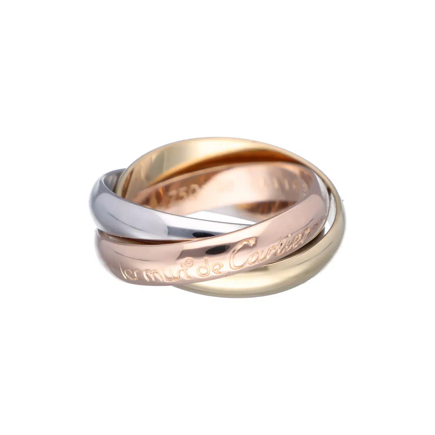 Der Cartier Trinity Classic Ring in Größe 49 ist ein begehrtes Sammlerstück, das durch seinen seltenen “Les Must de Cartier”-Schriftzug im Vintage-Stil besticht. Dieses einzigartige Schmuckstück kombiniert harmonisch Gelb-, Weiß- und Rotgold und repräsentiert die zeitlose Eleganz von Cartier.