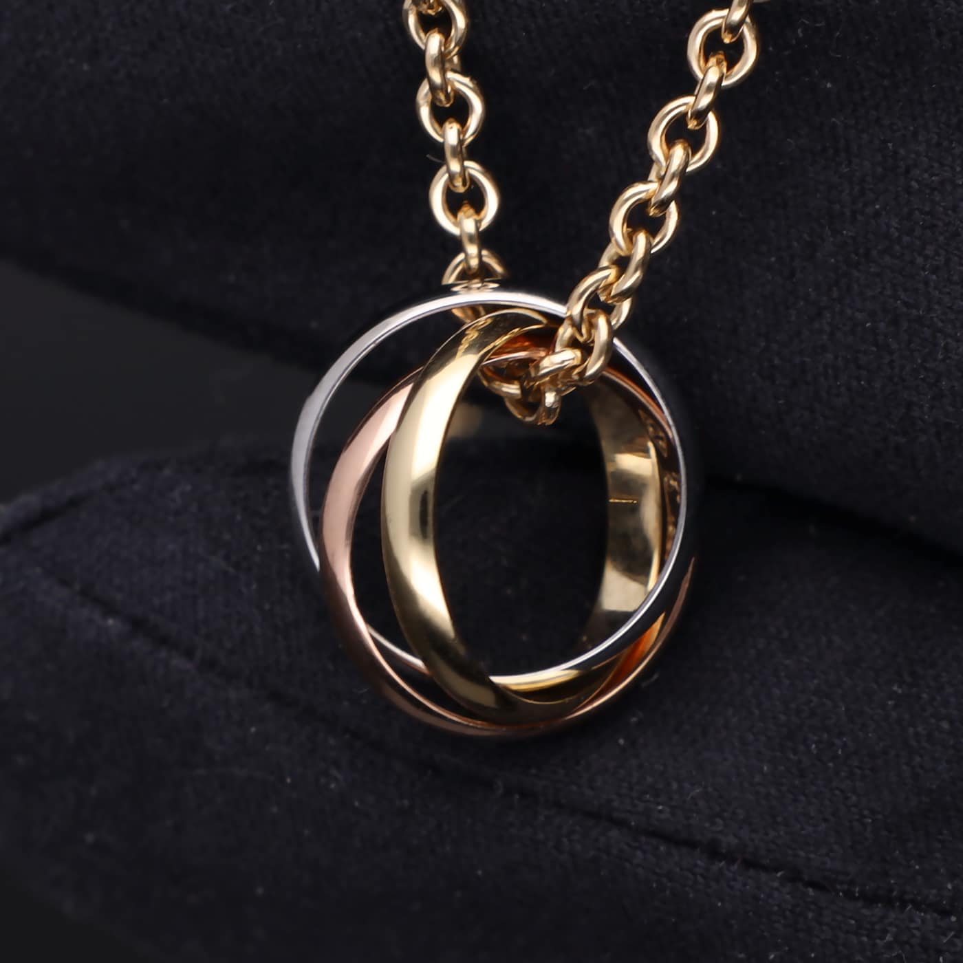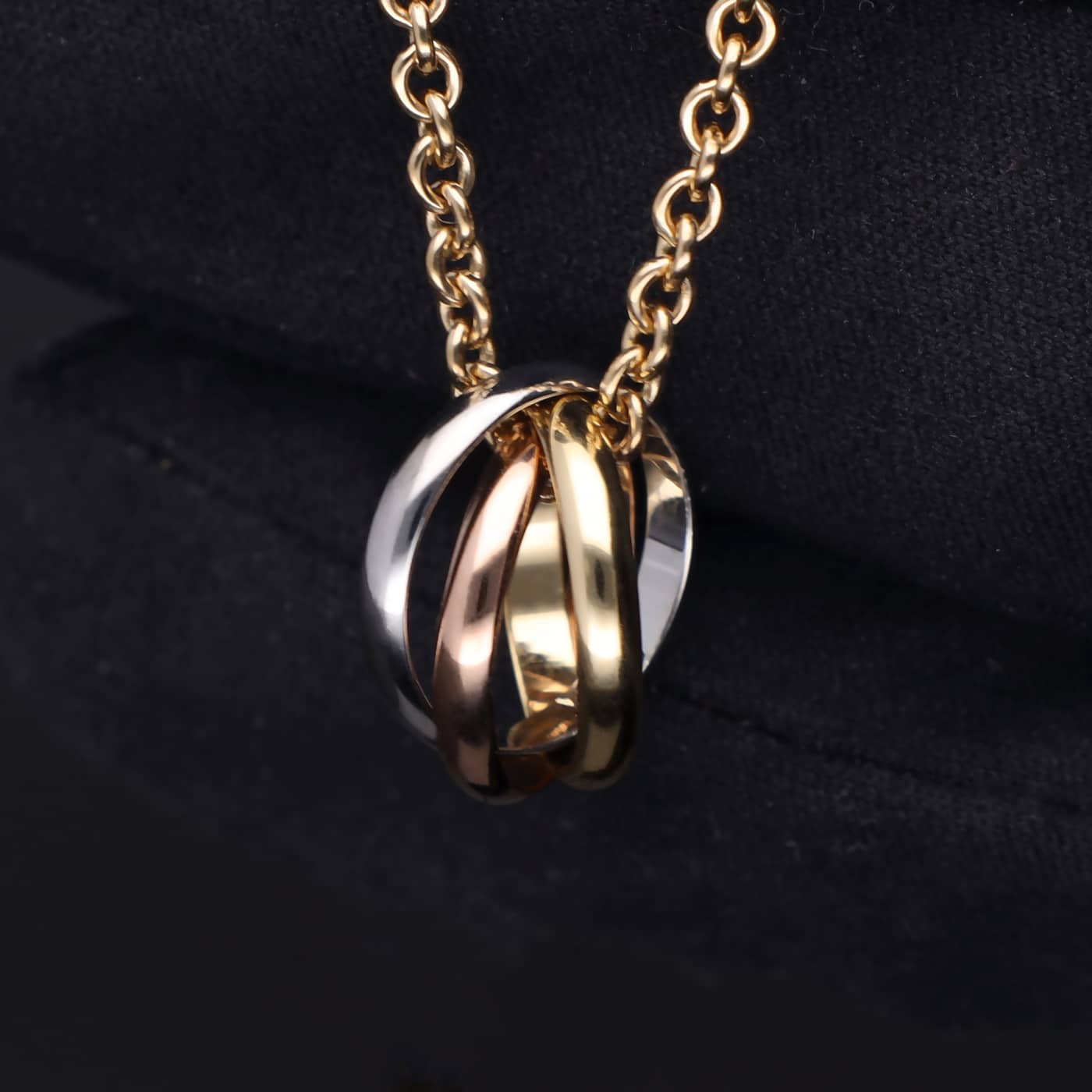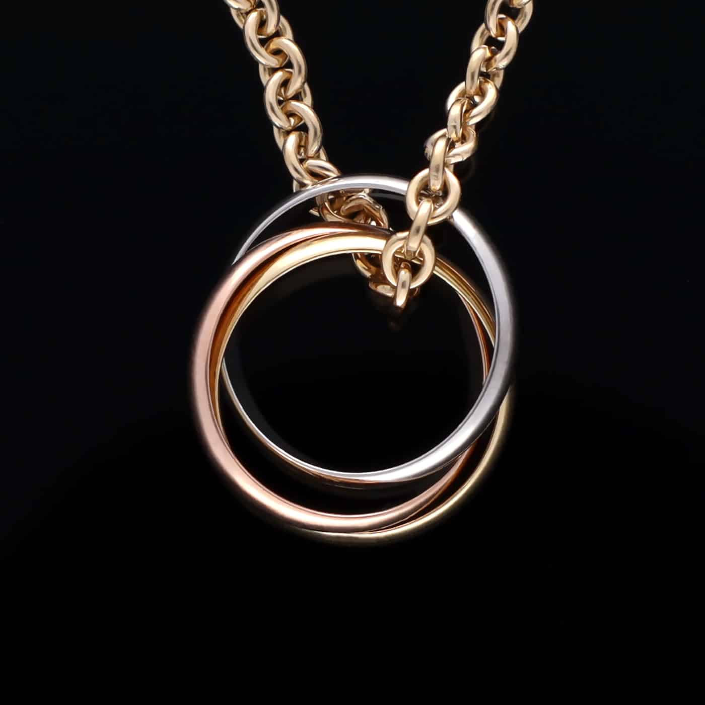 Die Cartier Trinity Halskette ist ein zeitloses Meisterwerk aus der legendären Trinity-Kollektion, die für ihre schlichte Eleganz und symbolische Bedeutung bekannt ist. Dieses exklusive Schmuckstück besteht aus 18 Karat (750er) Gelb-, Weiß- und Rosegold und besticht durch seine harmonische Kombination der drei Edelmetalle.