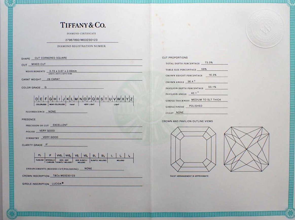 Geliefert wird das Schmuckstück inklusive original Tiffany & Co. Box, Diamant-Zertifikat, Tragetasche sowie Staubbeutel. Das Zubehör weist leichte Gebrauchsspuren auf, der Ring selbst ist jedoch hervorragend erhalten.